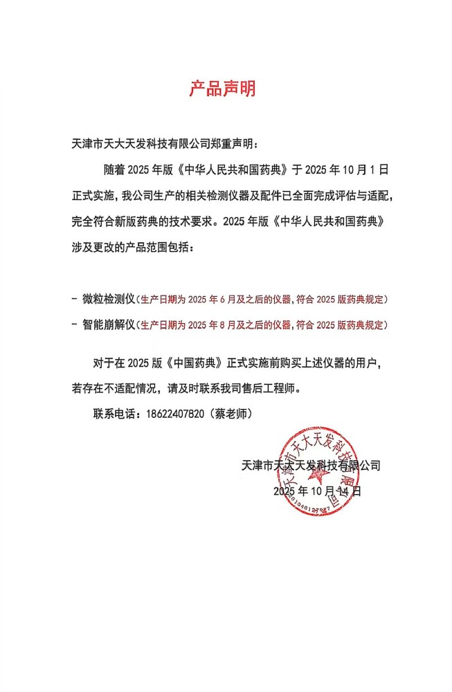 聲 明鑒于2025版《中國(guó)藥典》的更新,為保障天大天發(fā)忠實(shí)用戶的切身利益,凡在2025年之前購(gòu)置我公司設(shè)備的客戶,若您的設(shè)備未能滿足新版藥典的要求,我們將提供升級(jí)服務(wù)。涉及產(chǎn)品:微粒檢測(cè)儀:GWJ-1···...